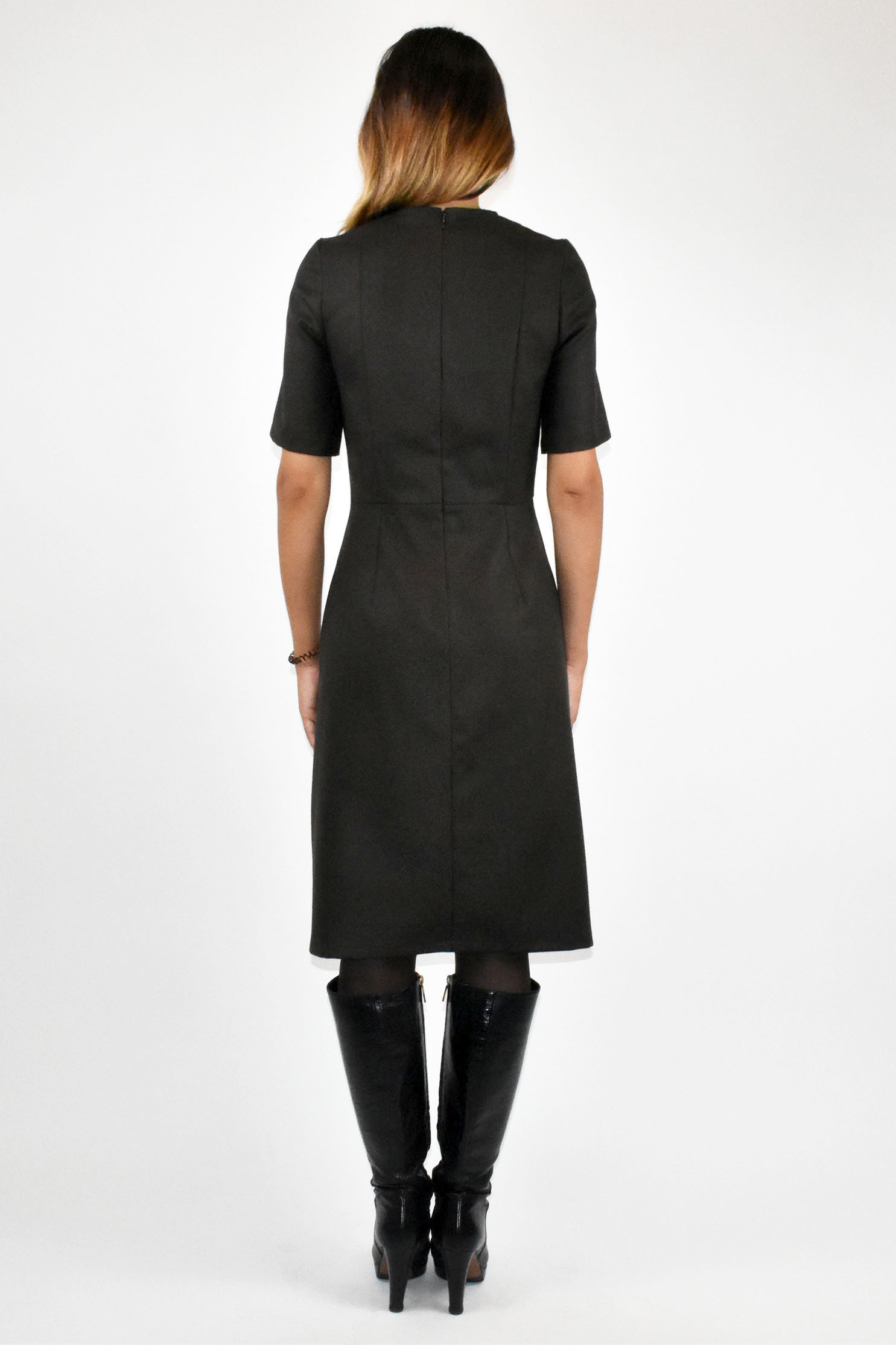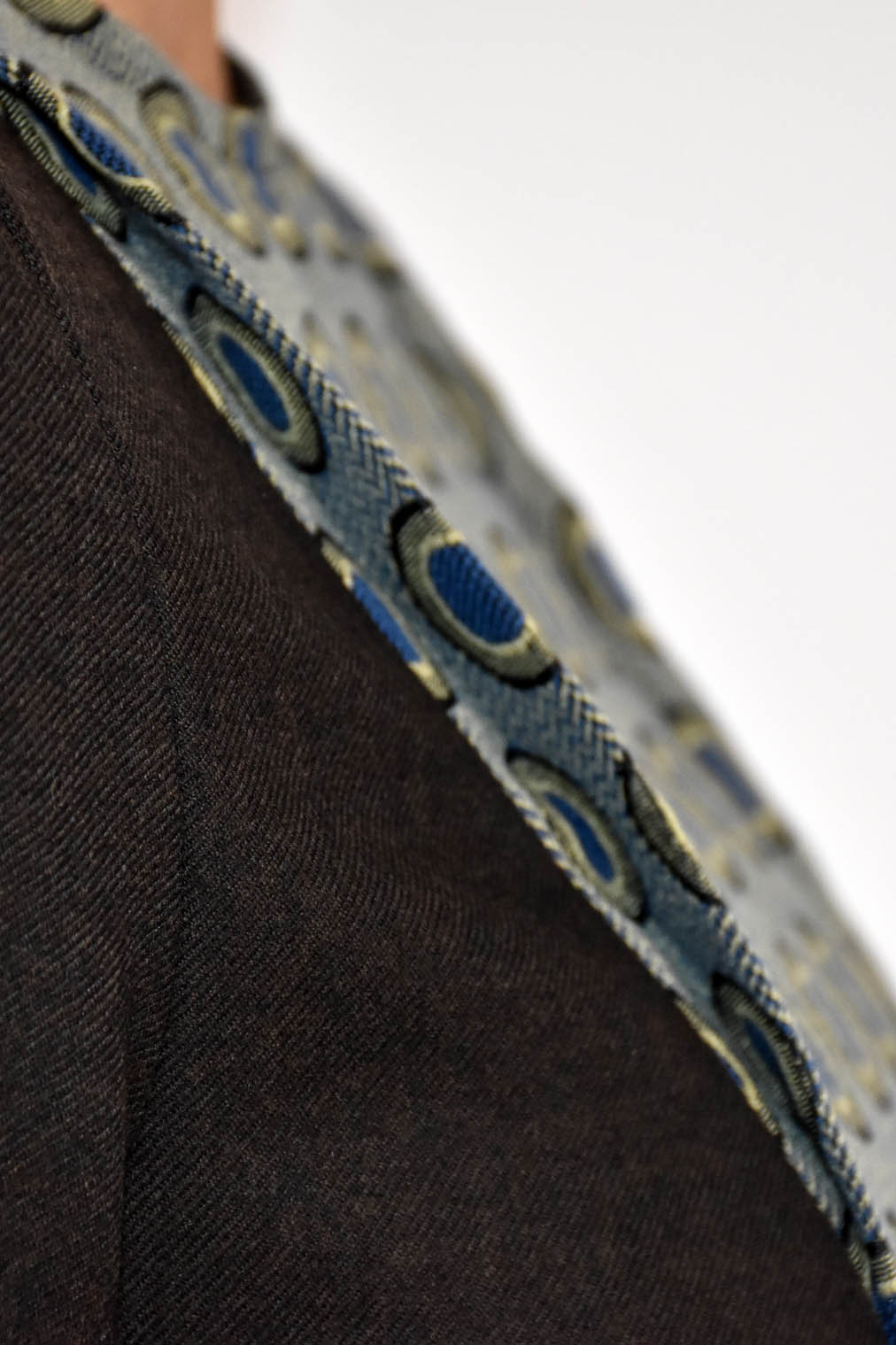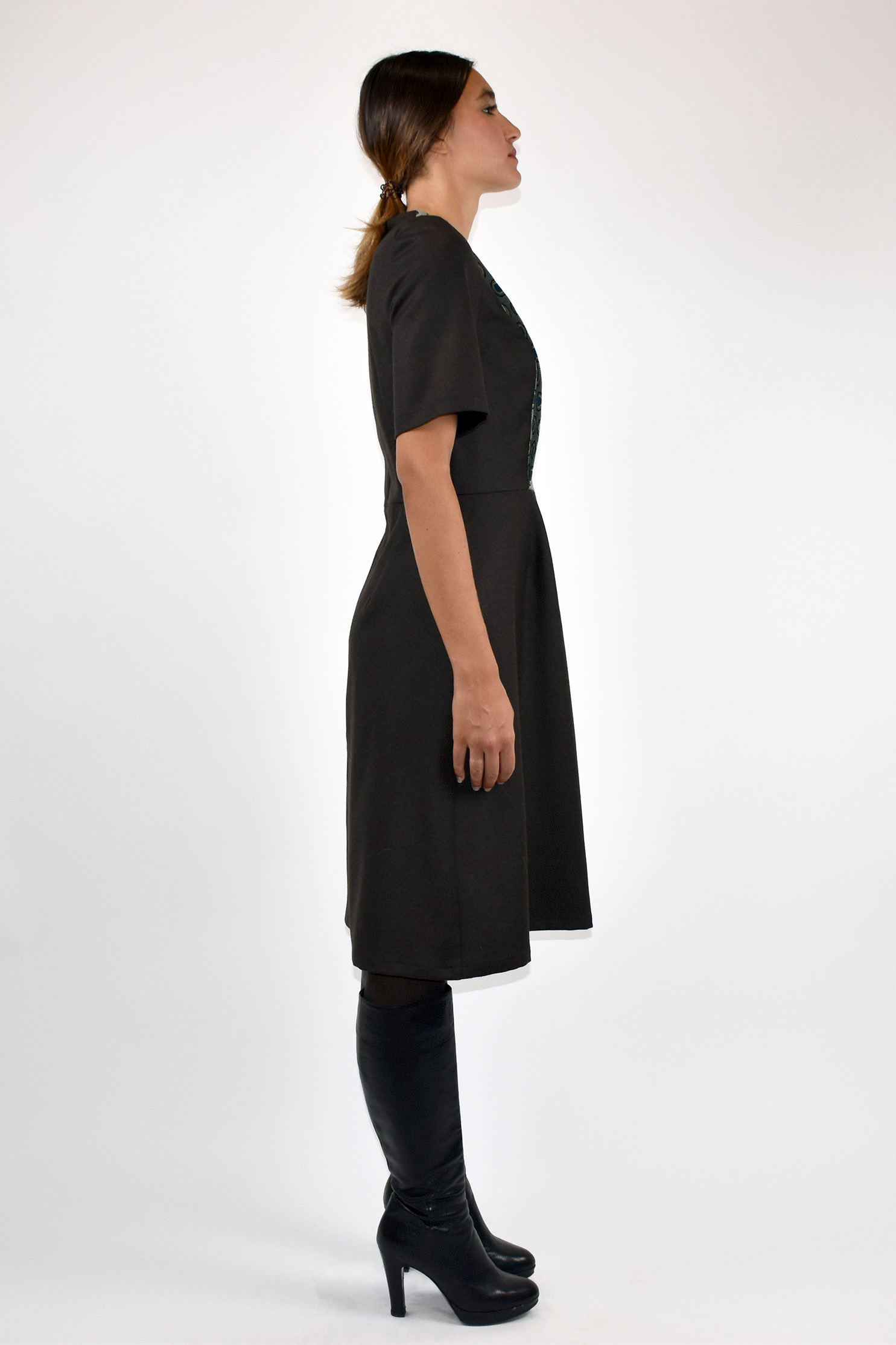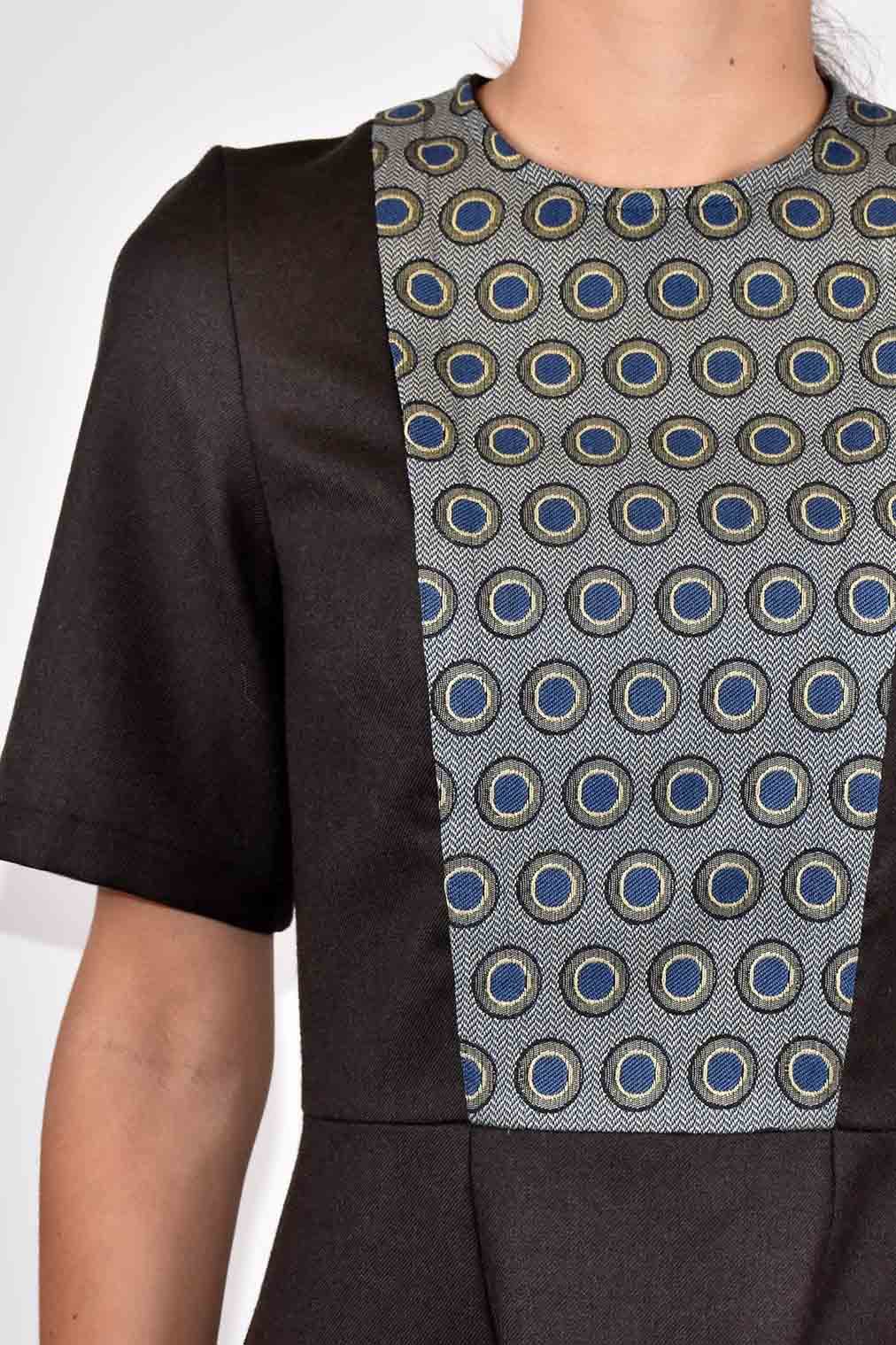 L'abito Grembiulino, in flanella color cioccolato, presenta una silhouette lineare con un'eco bon ton evidenziato dall'inserto in tessuto di recupero jacquard con motivo a occhio di pernice. Il design e la lunghezza rendono l'abito adatto a tutte le fisicità.