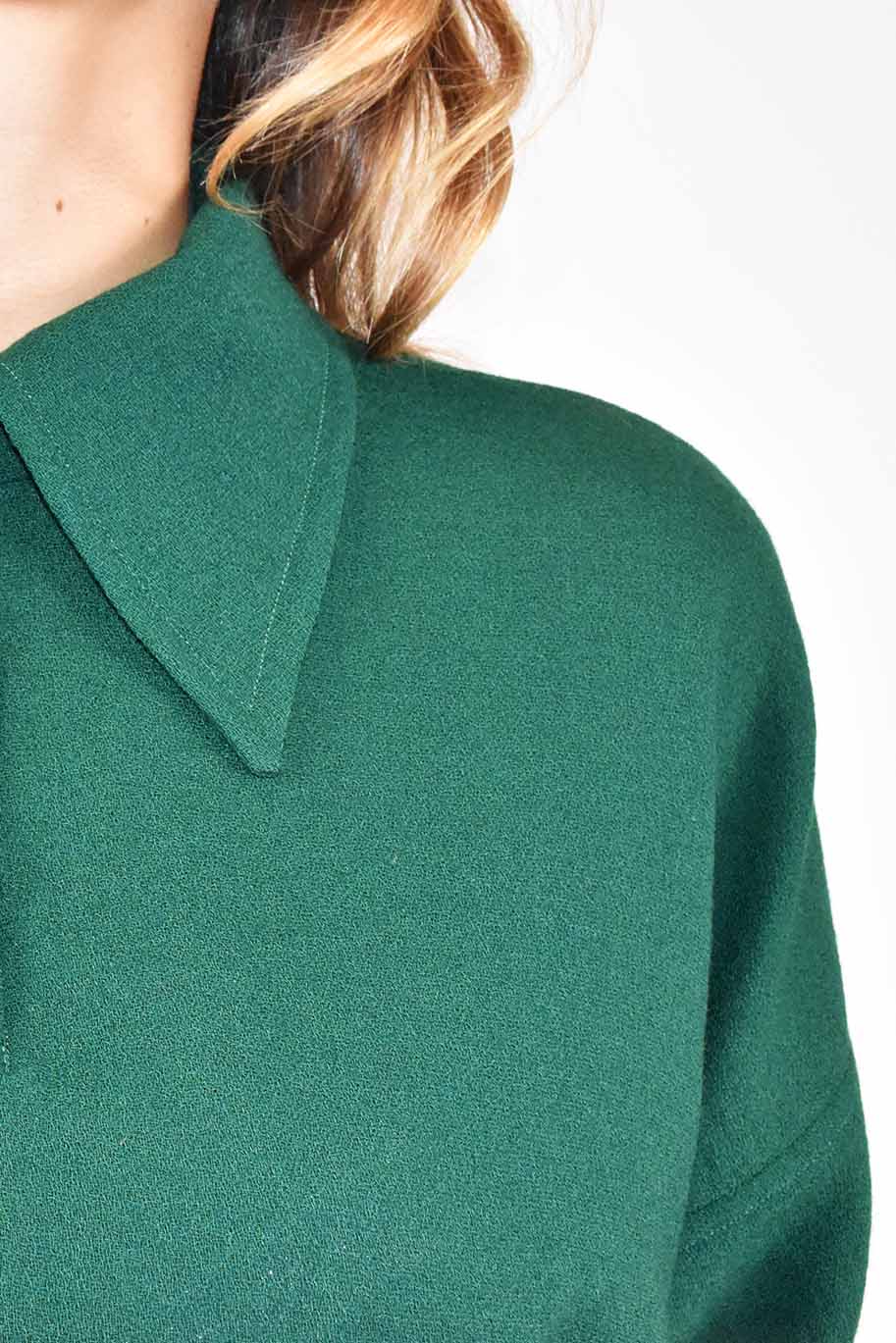 La blusa Foresta in crepe singolo di lana color verde foresta è caratterizzata da un design semplice con maniche a kimono e collo a polo che la rende adatta a tutte le fisicità e a molteplici abbinamenti.